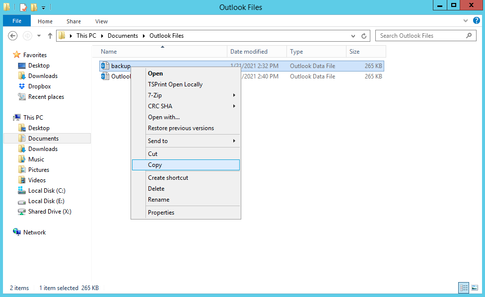 By default. Microsoft will place all of your .PST files in the “User/Documents/Outlook Files” folder. Find the .PST file labeled as a backup, and take an additional copy of it.