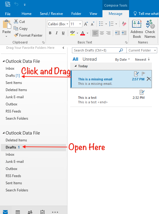 Now you will see an additional mailbox in your outlook. Open it up to see if your missing emails are there. Once you find them, all you need to do is to highlight the missing emails, and drag them into the same folder on your primary mailbox.